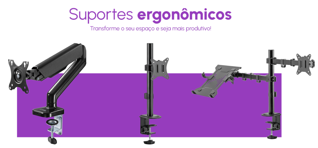 Indispensáveis para quem deseja melhorar a postura de maneira prática, os suportes articulados permitem ajustar a altura e o ângulo da tela conforme a sua necessidade.