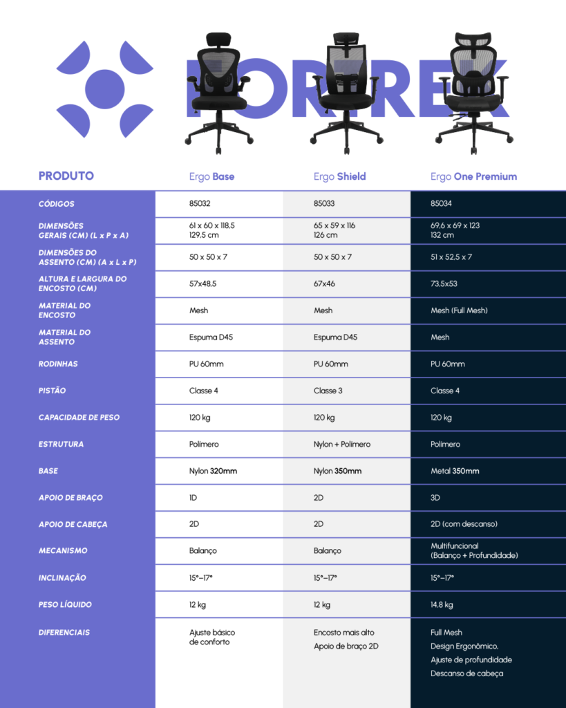 São 3 modelos disponíveis: Base, Shield e One Premium, a linha de cadeiras ERGO atende desde quem busca sair da cadeira tradicional e quer adotar uma rotina mais ergonômica, até quem busca uma cadeira que oferece múltiplas funcionalidades.